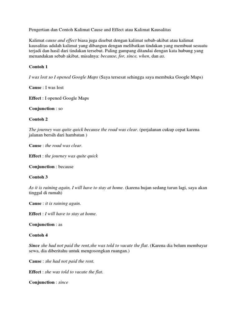 Yuk lihat 14+ contoh kalimat cause and effect. I am from Jogjakarta while my friends are from Jakarta Tasikmalaya Brebes and Purwokerto. Karena sedang hujan ia hanya tinggal di rumah saja - Momo went to bed because she was sleepy. Induk kalimat menyatakan sebab dan anak kalimat menyatakan akibat. Lihat juga contoh:contoh dan contoh kalimat cause and effect Dimana dalam setiap kejadian itu selalau ada sebuah sebab dan juga sebuah akibat yang ditumbulkan seperti contoh.